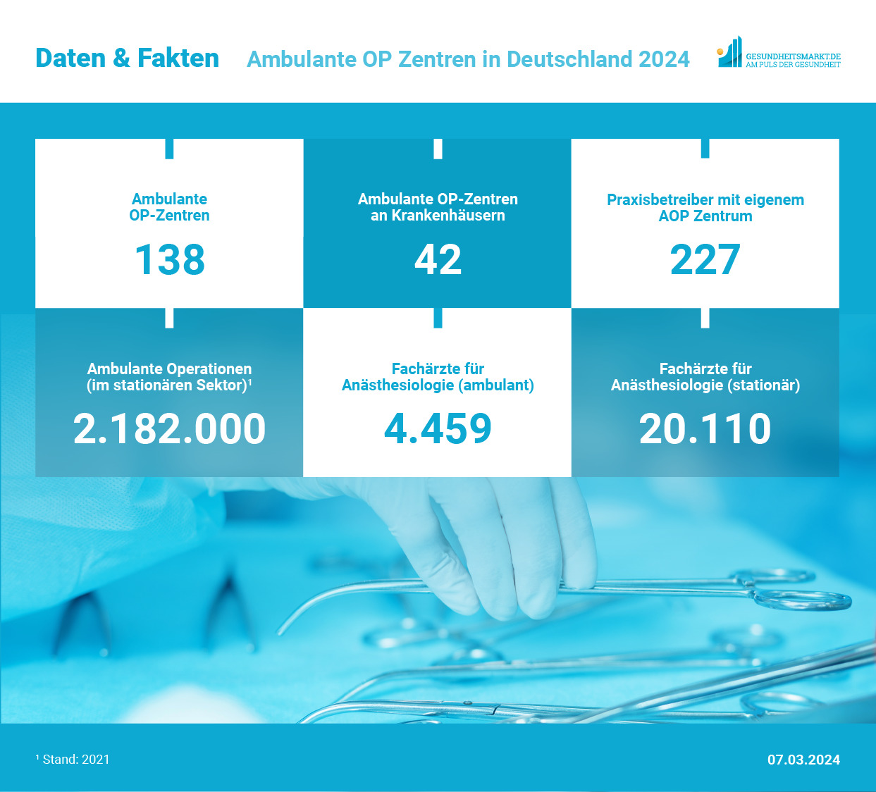 Deutschlandweit gibt es aktuell insgesamt 180 Ambulante OP-Zentren, wovon 42 Ambulante OP-Zentren an Krankenhäuser angegliedert sind. Darüber hinaus bieten im ambulanten Sektor auch eine Vielzahl an Arztpraxen heutzutage ambulante Operationen im praxiseigenen Ambulanten OP-Zentrum. Praxen dieser Art gibt es insgesamt 227 deutschlandweit. Nach Auswertung aller Qualitätsberichte deutscher Kliniken, fanden im Jahr 2021 in Summe 2.182.000 ambulante Operationen im stationären Sektor statt. Angesichts der fortschreitenden Ambulantisierung sowie zahlreichen gesundheitspolitischen Maßnahmen, wie die Einführung von Hybrid-DRGs und die Erweiterung des AOP-Katalogs, ist mit einer steigenden Anzahl ambulanter Operationen in den nächsten Jahren zu rechnen, sowohl im ambulanten als auch stationären Sektor. Der Kassenärztlichen Bundesvereinigung zu entnehmen, arbeiten aktuell 20.110 Fachärzte für Anästhesiologie im stationären Sektor und 4.459 Fachärzte für Anästhesiologie im ambulanten Sektor.