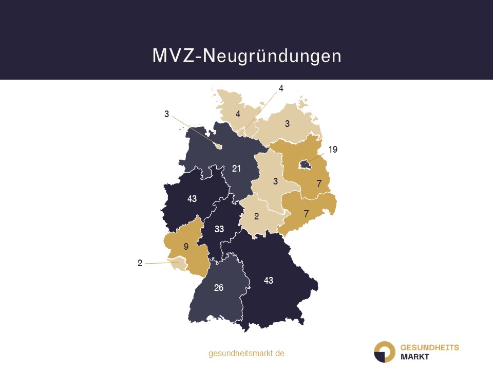 Im Jahr 2025 gab es deutschlandweit bisher insgesamt 229 MVZ GmbH Neugründungen. Im Vergleich zu den MVZ-Neugründungen von Januar bis November 2024 bedeutet dies ein Plus von mehr als 52 Prozent. Im bisherigen Jahresverlauf wurden die meisten MVZs in den Bundesländern Nordrhein-Westfalen und Bayern mit jeweils 43, und in Hessen mit 33 Neugründungen gegründet.