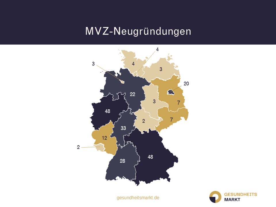 Im Jahr 2025 gab es deutschlandweit insgesamt 246 MVZ GmbH Neugründungen (inkl. zahnärztliche MVZ). Im Vergleich zu den MVZ-Neugründungen 2024 bedeutet dies ein Plus von mehr als 42 Prozent. Im Jahresverlauf 2025 wurden die meisten MVZs in den Bundesländern Nordrhein-Westfalen und Bayern mit jeweils 48, und in Hessen mit 33 Neugründungen gegründet.