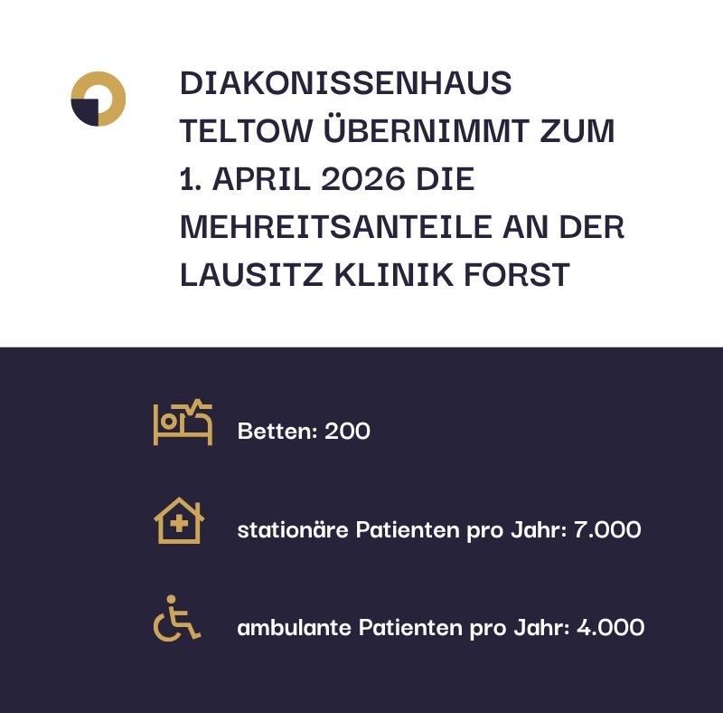 In der Lausitz wechseln die Mehrheitsanteile an der Lausitz Klinik Forst vom Klinikum Ernst von Bergmann zum Diakonissenhaus Teltow. Das teilt die Ernst von Bergmann-Gruppe in einer Pressemeldung mit. Seit Mai 2014 war die Klinik Forst Teil der Ernst von Bergmann-Gruppe, die gemeinsam mit der Stadt Forst die Gesellschafterrolle innehatte. Zum 1. April 2026 verkauft das Klinikum Ernst von Bergmann seine Anteile an die Stiftung Evangelisches Diakonissenhaus Berlin Teltow Lehnin.
