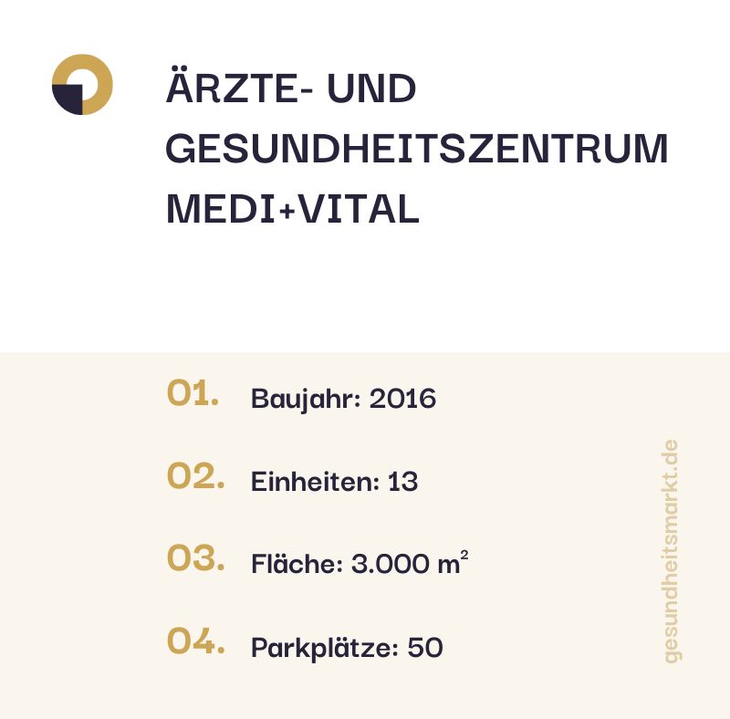 Das im Jahr 2016 fertiggestellte Ärzte- und Gesundheitszentrum ist in ausgezeichnetem Zustand. Es bietet 13 Einheiten auf etwa 3.000 Quadratmetern vermietbarer Fläche. Alle Einheiten sind vermietet und die Mieter konzentrieren sich vollständig auf den Gesundheitssektor und verwandte Dienstleistungen. Im Zentrum finden sich verschiedene Facharztpraxen sowie Einrichtungen für Physiotherapie, Podologie und Ergotherapie, ergänzt durch ein Rehabilitations- und Fitnesszentrum. Zudem beherbergt das Gebäude eine Apotheke, ein Sanitätshaus und eine Krankenkasse.