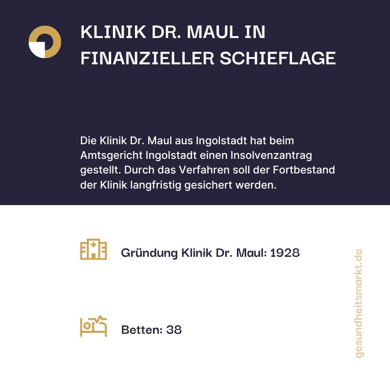 Die Klinik Dr. Maul aus Ingolstadt hat einen Eigeninsolvenzantrag gestellt. Das berichtet der Donaukurier. Demnach hat das zuständige Amtsgericht Ingolstadt eine vorläufige Insolvenzverwaltung angeordnet. Zum vorläufigen Insolvenzverwalter wurde Rechtsanwalt Hubert Ampferl von der Rechtsanwaltskanzlei Dr. Beck & Partner bestellt.