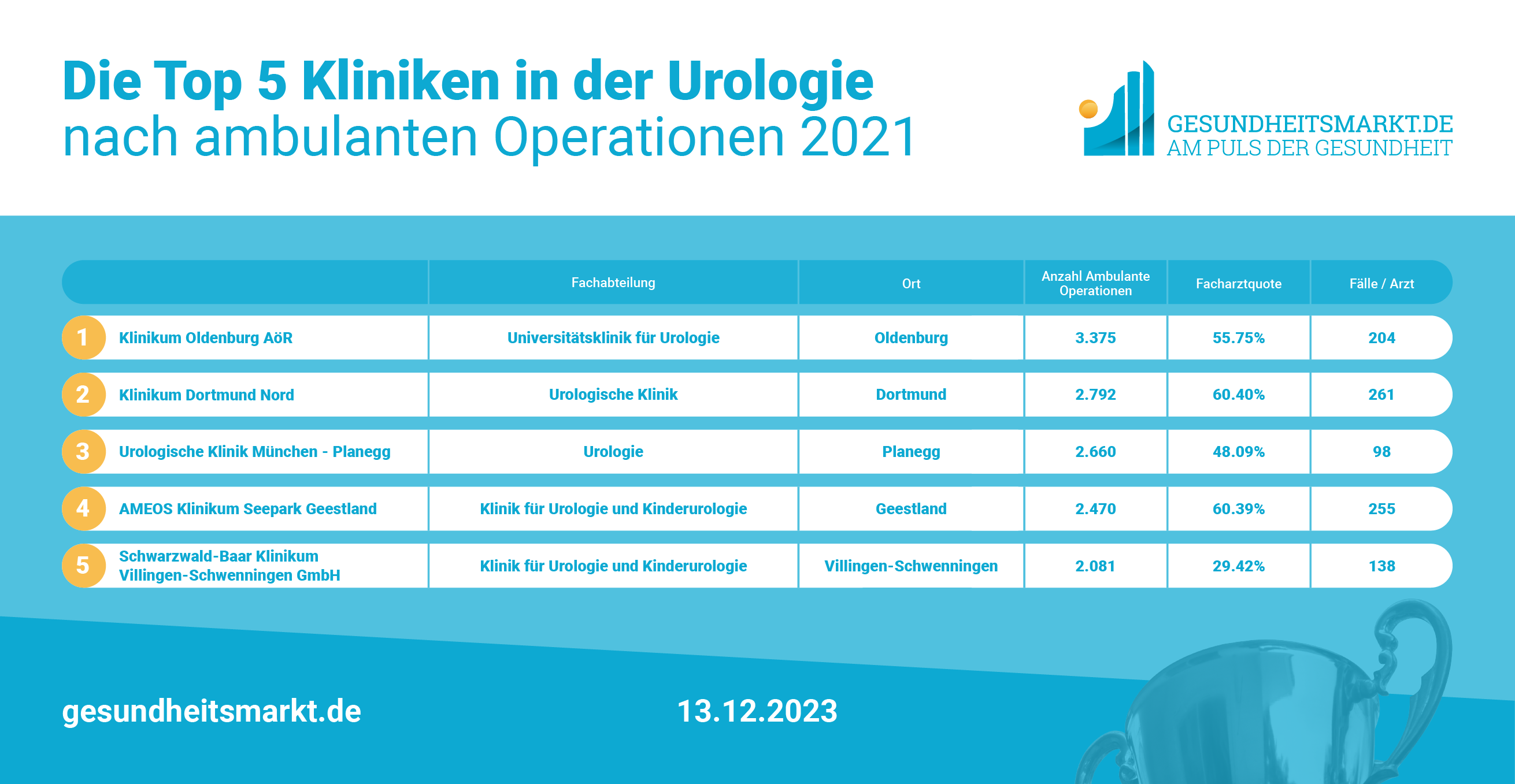 Den ersten Rang belegt das Klinikum Oldenburg AöR mit ihrer Universitätsklinik für Urologie, an denen im Jahr 2021 insgesamt 3.375 ambulante Operationen durchgeführt wurden. Knapp über die Hälfte der hier tätigen Ärzteschaft sind Fachärzte. Die Universitätsklinik für Urologie zählt zu den größten Fachkliniken zur operativen Behandlung von Prostatakrebs und bei gutartiger Prostatavergrößerung (Lasertherapie) in Deutschland. Die Klinik gehört der Stadt Oldenburg und liegt in kommunaler Hand.