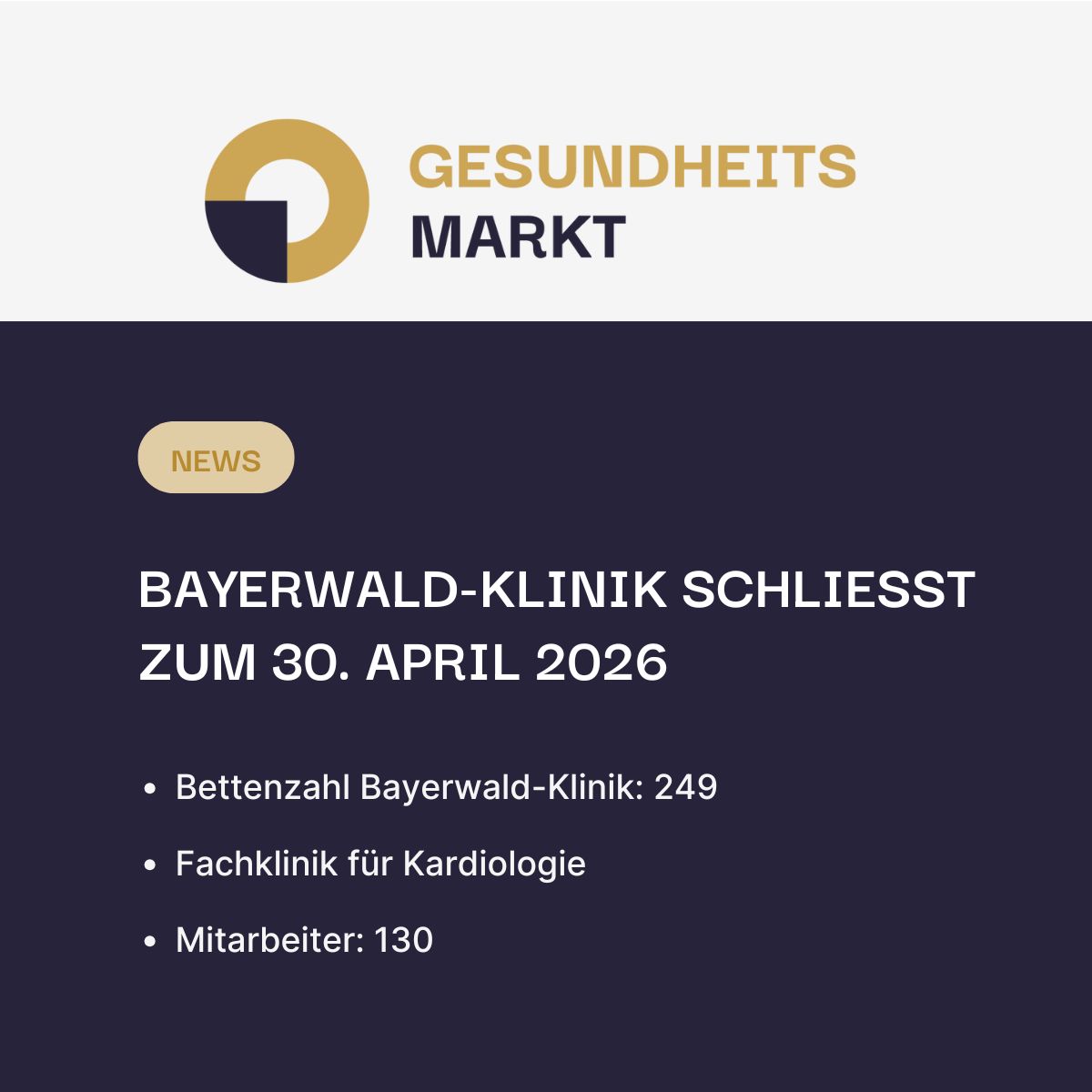 Die Schließung der Bayerwald-Klinik steht bevor. Das berichtet die Mittelbayerische Zeitung. Demnach soll die Rehaklinik laut einer Mitteilung des Trägers, der Maternus-Kliniken AG, zu Ende April 2026 geschlossen werden. Die Bayerwald-Klinik zählt nach eigenen Angaben zu den größten Rehabilitationskliniken in der Region Regensburg und der Oberpfalz. Von der bevorstehenden Schließung sind mehr als 100 Mitarbeiter betroffen.
