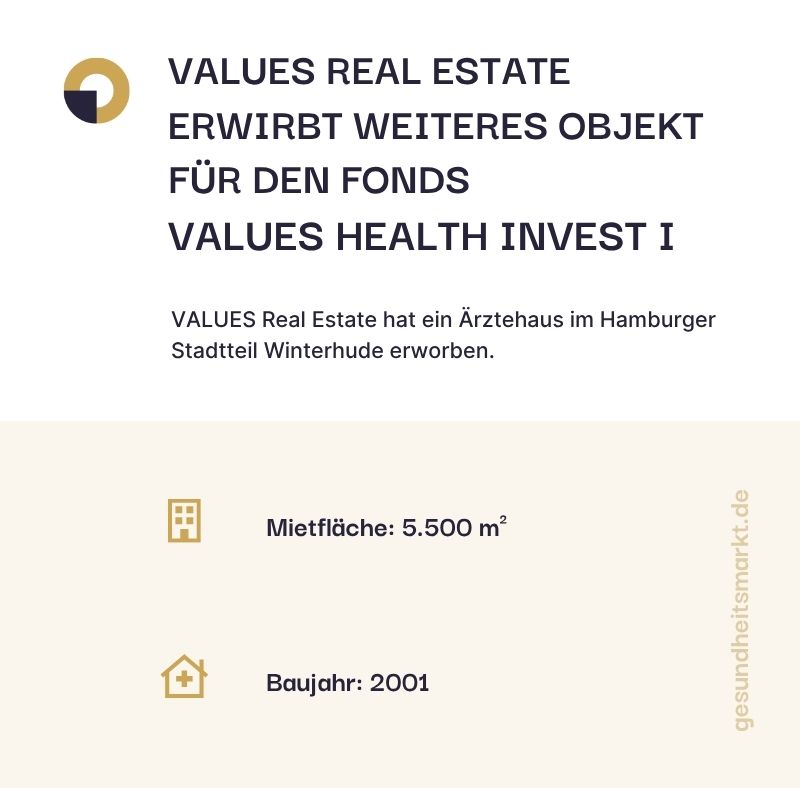 Die Gesundheitsimmobilie wird in den institutionellen Fonds VALUES Health Invest I aufgenommen. Wegen der starken Nachfrage seitens Investoren nach ambulanten Gesundheitsimmobilien sowie einer vielversprechenden Pipeline, wird er für weiteres Fundraising geöffnet und ausgebaut. Der Fonds konzentriert sich auf Ärztehäuser und Medizinische Versorgungszentren in ganz Deutschland. Zuletzt hatte VALUES Real Estate das Ärztehaus „MAINMED Flörsheim“ erworben.