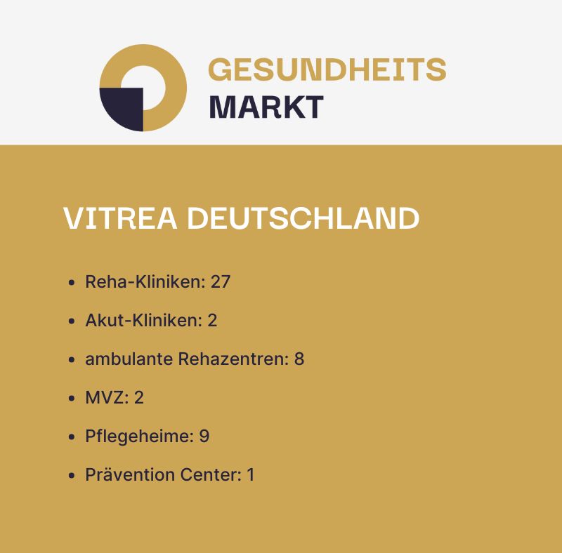 Mit VITREA entsteht eine bedeutende neue Reha-Gruppe im deutschsprachigen Raum. Durch den Zusammenschluss der Reha-Einrichtungen von VAMED und den Paracelsus Rehabilitationskliniken vereint das Unternehmen, das seinen Hauptsitz in Wien und die deutsche Zentrale in Damp hat, über 70 stationäre und ambulante Einrichtungen in Deutschland, Österreich und der Schweiz. Damit zählt VITREA zu den größten Gesundheitsanbietern Europas, heißt es in der Pressemeldung des Unternehmens.